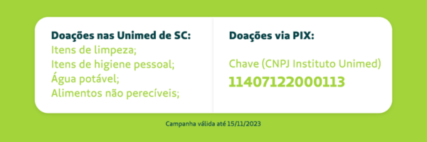 Saúde também se faz com solidariedade. Por isso, o Instituto Unimed SC integrou as 22 Cooperativas Médicas Unimeds do estado de Santa Catarina numa ação para ajudar na reconstrução dos municípios mais afetados pelas fortes chuvas deste mês de outubro. A campanha “MÃOS DADAS POR SANTA CATARINA” foi lançada nesta quarta-feira, 18 de Outubro – Dia do Médico, durante o evento UniExperience, em Criciúma, com a reunião de lideranças da saúde e empresariais. A meta é arrecadar alimentos, água, produtos de limpeza e de higiene, além de doações em dinheiro, que vão se transformar em diversos insumos e até material de construção.